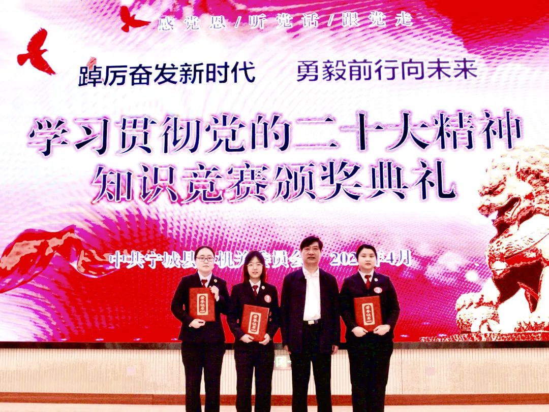4月26日,宁城县委机关党委“踔厉奋发新时代、勇毅前行向未来”——党的二十大精神知识竞赛决赛在县文化大厦六楼举行。宁城县检察院党总支由韩靓、刘慧颖、穆雅如三名同志组成的代表队,荣获二等奖。