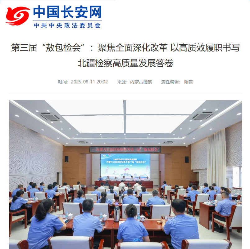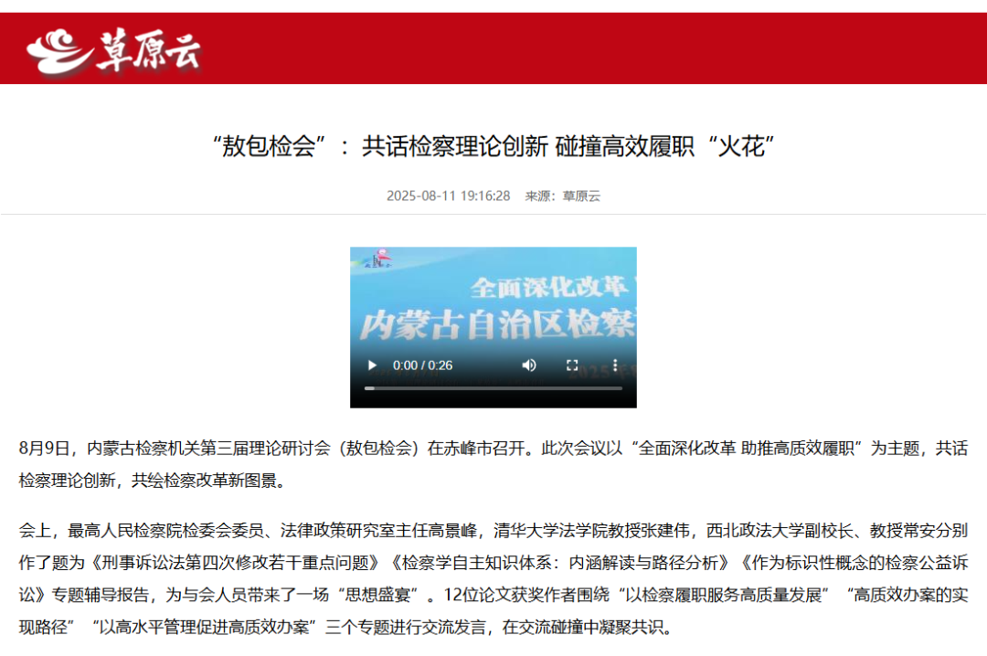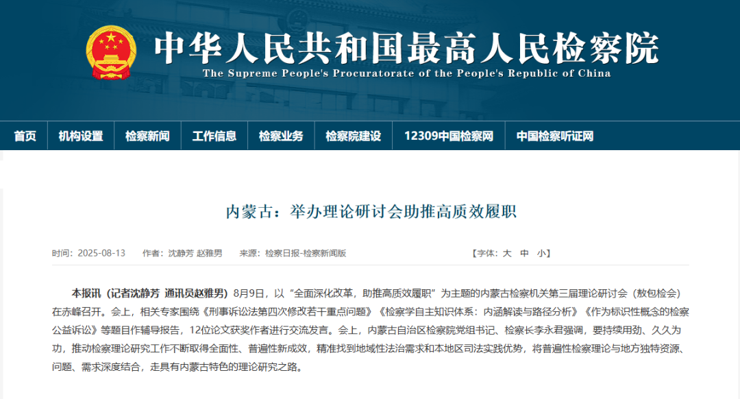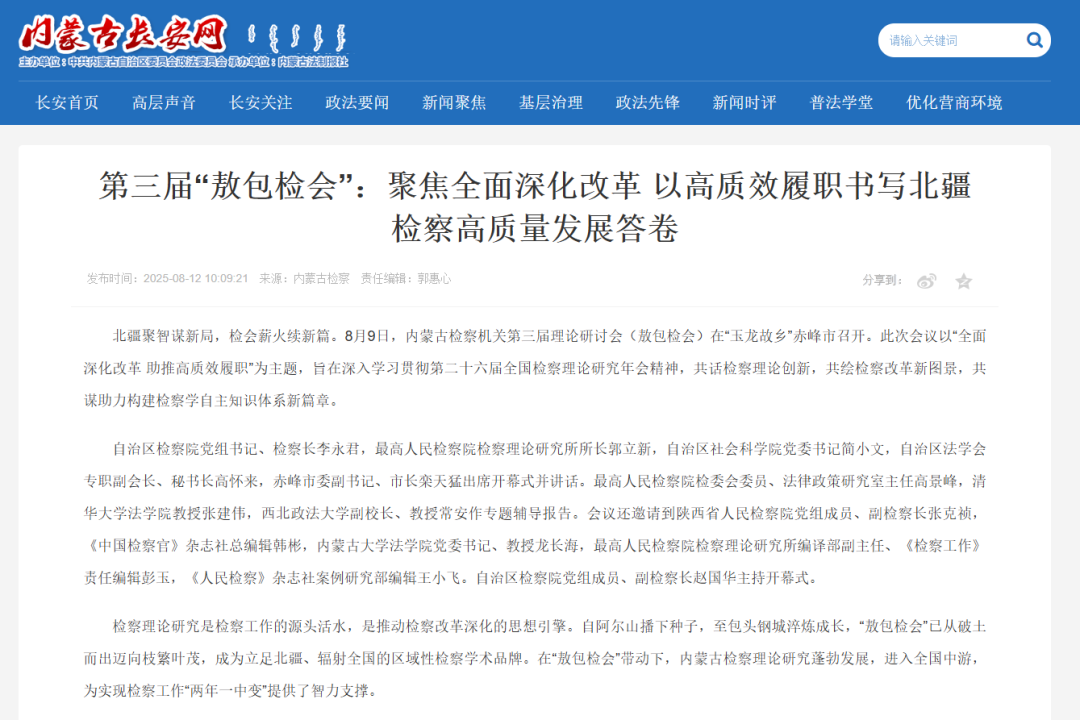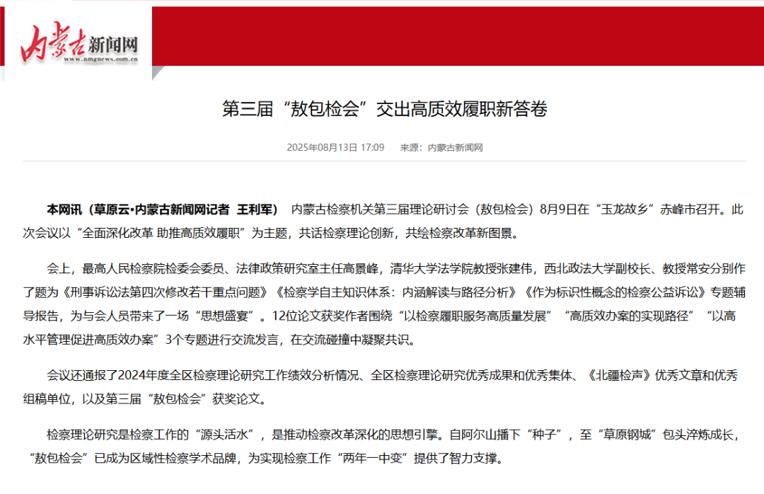 近日,由自治区检察院主办、赤峰市检察院承办的以“全面深化改革 助推高质效履职”为主题的内蒙古检察机关第三届理论研讨会(“敖包检会”)在赤峰市召开。此次会议向全区和周边10个省区市检察机关征集论文1456篇,经组织专家评审,共评选出优秀论文120篇。会上,与会代表围绕会议主题,就“以检察履职服务高质量发展”“高质效办案的实现路径”“以高水平管理促进高质效办案”等专题进行了深入研讨、交流。该会议被中国长安网、法治网、《检察日报》、草原云等多家中央、省级主流媒体关注和报道。